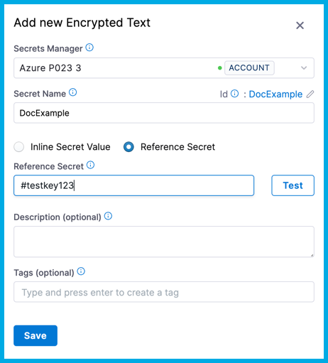 • Reference Secret: Enter the name of the existing secret in your Secret Manager that you want the Reference Secret to refer to, and then select Test to test the reference path. You can reference existing secrets in Azure Key Vault, Hashicorp Vault, AWS Secrets Manager, or GCP Secrets Manager.