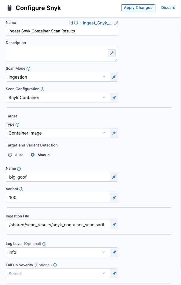 5. In the Ingestion File field, enter /shared/scan_results/snyk_container_scan.sarif