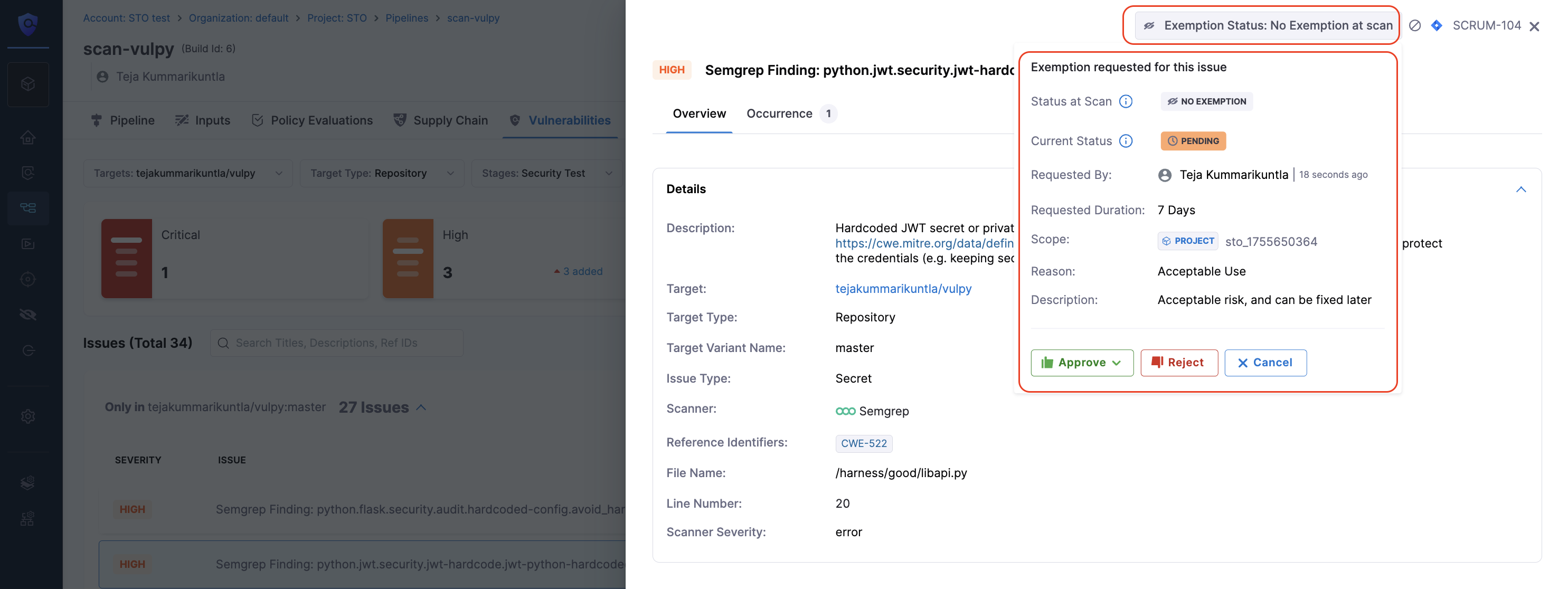 • Remediation: Steps from Harness AI and Scanner (see Fix security issues using Harness AI).