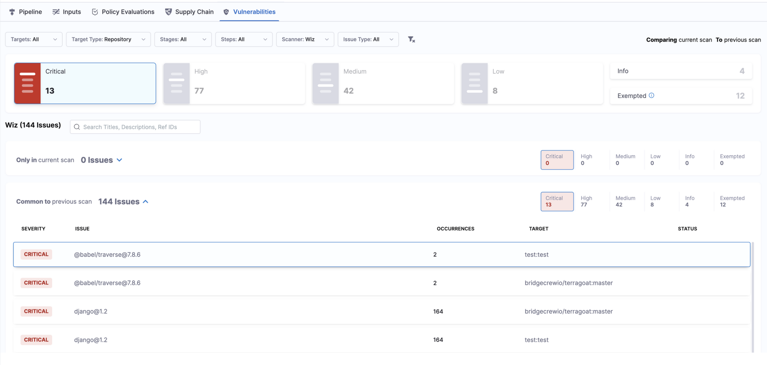 • Common to <target>:<baseline>: Issues present both in the scanned variant and the baseline.