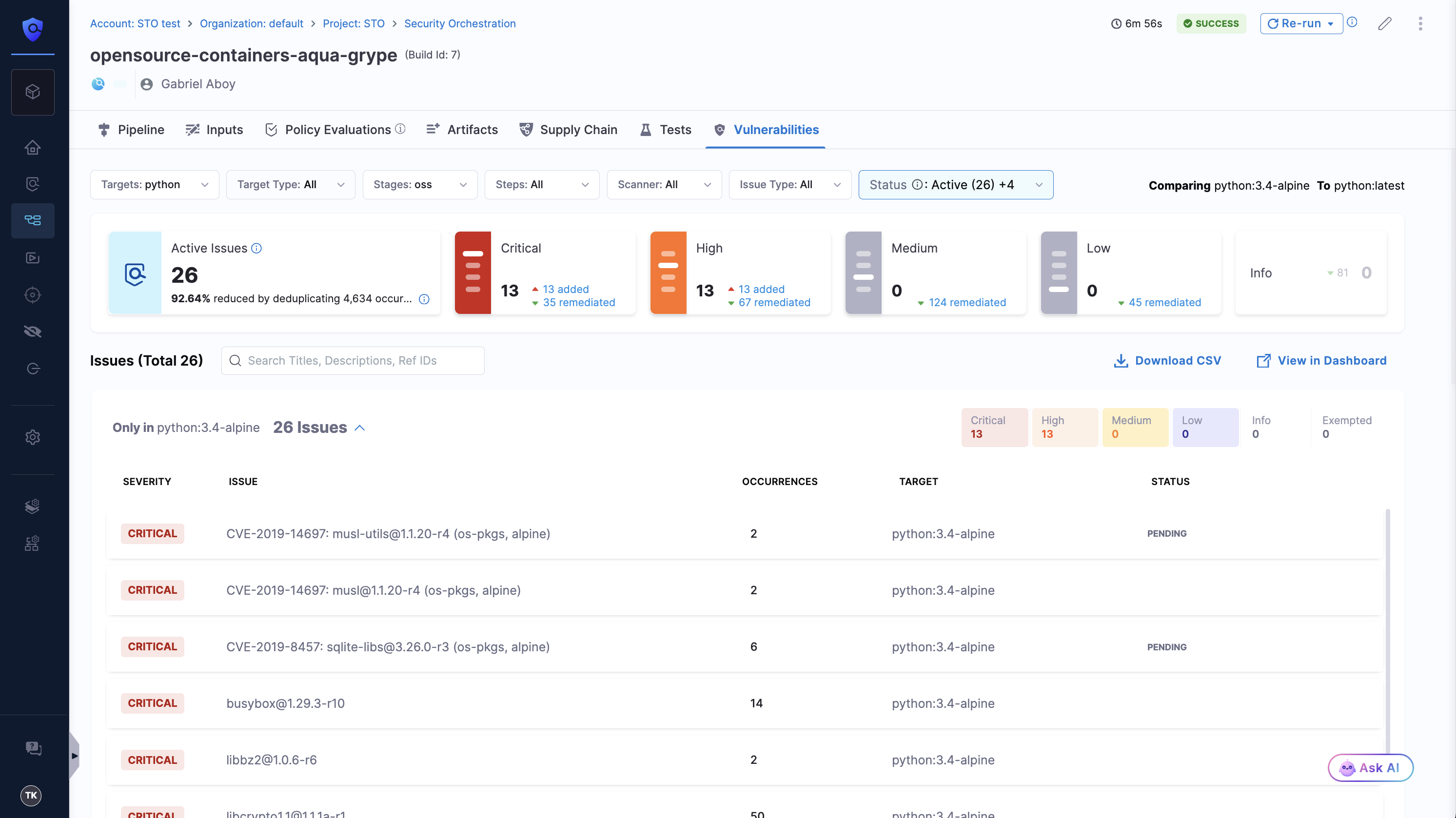 The Active Issues count shows the number of vulnerabilities that still require action. It excludes any issues marked as Exempted or Remediated. This count also reflects how well STO’s deduplication logic is working by showing the percentage reduction in issues compared to the raw scan results.