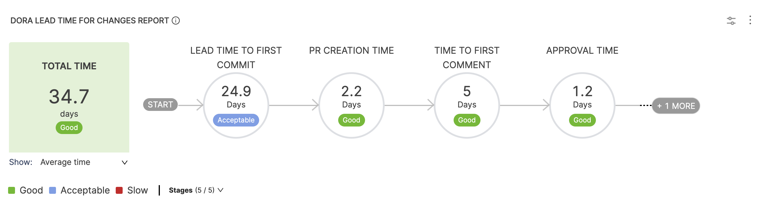- The overall Lead Time is the sum of the average time spent in each stage. This is where you can determine where teams are spending their time and whether this is an acceptable range.
