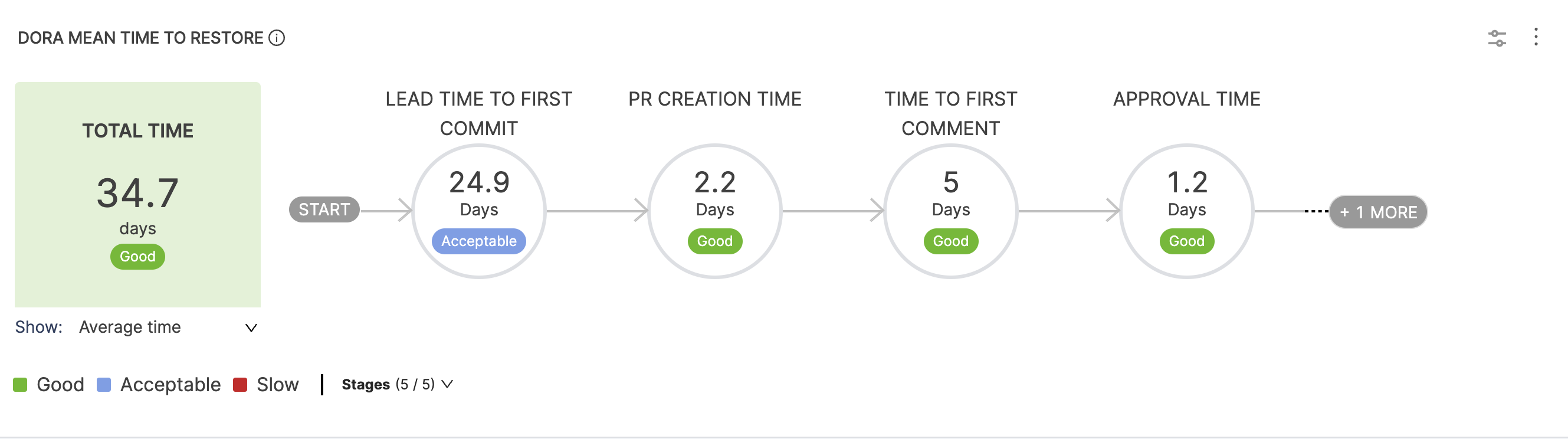 Overall lead time is the sum of the time spent in each stage in a workflow, such as commit-to-deployment time for a change, open-to-merge time for PRs, or the issue workflow for issues in your issue management system. Lead time can help identify where a team is spending time and if the amount of time spent in each stage falls in an acceptable range.
