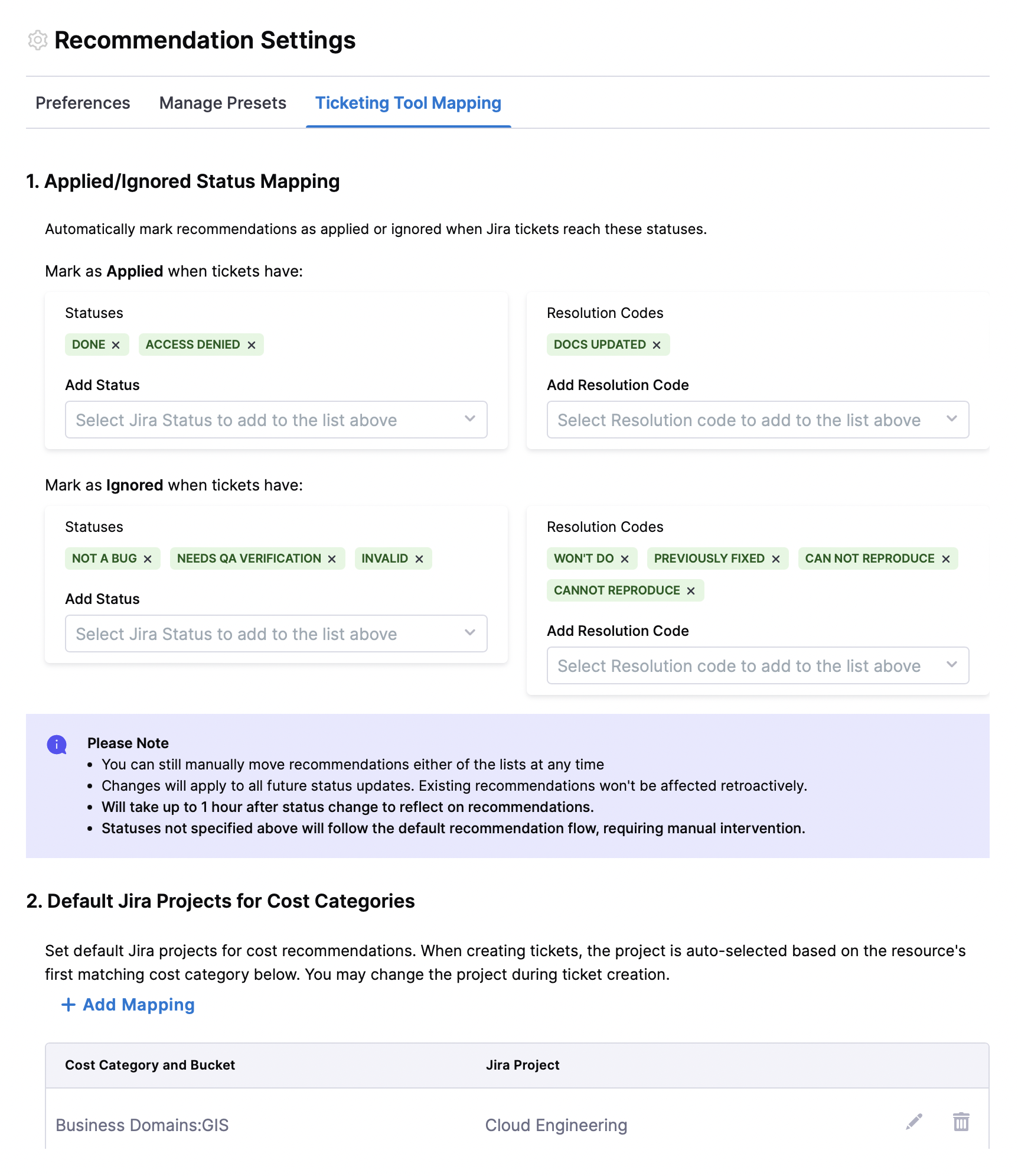 Status Mapping with Resolution Codes: Earlier, we introduced the ability to automatically update recommendation statuses based on Jira ticket status changes. Now, you can also choose Resolution Codes that will automatically update recommendations to Applied status.
